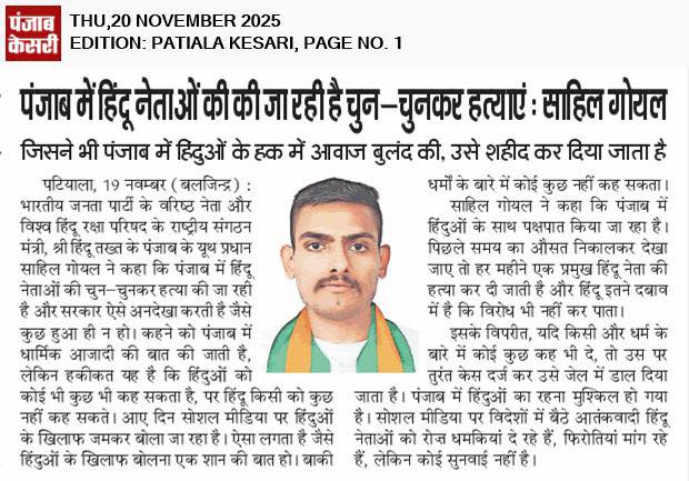 साहिल गोयल भारतीय जनता पार्टी से जुड़े एक समर्पित एवं कर्मठ वरिष्ठ भाजपा नेता हैं, जो राष्ट्रवाद, सांस्कृतिक चेतना और युवाओं के सशक्तिकरण के लिए निरंतर कार्यरत हैं। वे संगठनात्मक क्षमता, स्पष्ट विचारधारा और जमीनी स्तर पर सक्रिय नेतृत्व के लिए जाने जाते हैं।